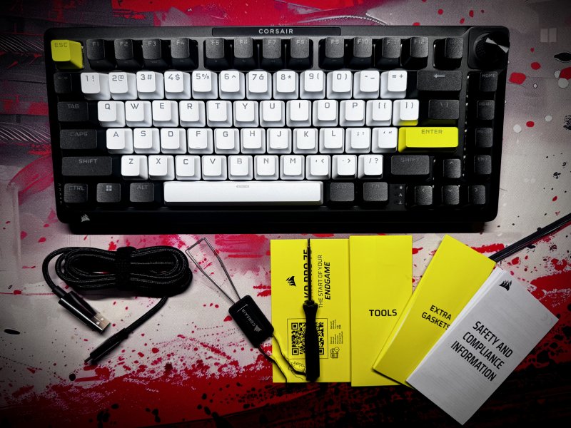 Pierwszy kontakt z tym sprzętem to solidne zaskoczenie jeszcze przed odpakowaniem. Mimo rozmiaru 75% to naprawdę solidny kawał klawiatury i najcięższy zawodnik, jakiego gościło moje biurko, za sprawą 1,3 kg wagi. Po otwarciu pudełka poza gościem programu, dostępny mamy przewód USB-C/USB-A o długości 1,8 m, oraz dedykowane narzędzie do wyjmowania klawiszy oraz przełączników. Ponadto, ze względu na możliwości rozbudowy, producent zadbał o obecność odpowiedniego wkrętaka, garści dodatkowych śrub, gumowych podkładek oraz instrukcji w formie kodu QR.