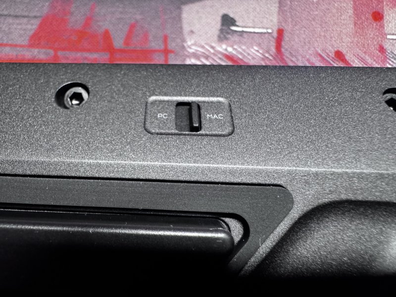Przy tej okazji jeszcze warto napomknąć, iż od frontu klawisze mają nadrukowane także funkcje dla systemu MacOS, co mnie osobiście bardzo cieszy. Producent poszedł nawet krok dalej i z tego względu od spodu sprzętu, mamy dedykowany przełącznik pomiędzy PC, a systemem Mac właśnie. Pozwala to wykorzystać pełny potencjał klawiatury bez względu na preferowany OS w naszym domowym zaciszu.
