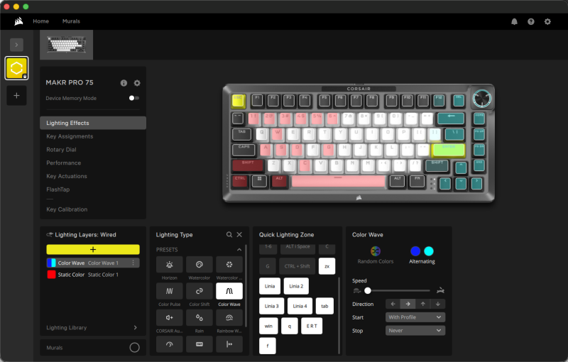 Największe wrażenie jednak robi fakt, że poza ogromną gamą dostępnych w apce efektów iluminacji, możemy stworzyć własne wariacje, nawet poprzez programowanie każdego z klawiszy indywidualnie! To jest absolutny game changer. Da się to nawet połączyć z ogólno dostępnymi efektami, dzięki czemu te mogą się przenikać, lub można zadbać, aby wybrane klawisze świeciły stale, ignorując efekt pozostałych. Jest tutaj naprawdę sporo możliwości i tego po produkcie za taką kwotę oczekiwałem.