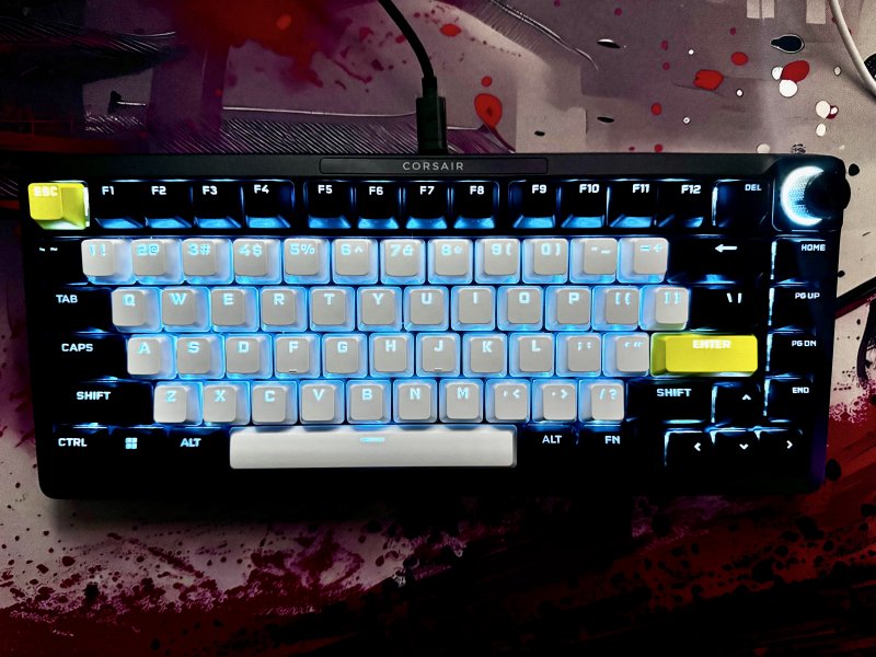 Układ 75% to oczywisty brak bloku numerycznego, ale w tym konkretnym przypadku różnic w kontekście klawiszy jest więcej. Corsair postanowił pochylić się w kierunku tych, którzy cenią sobie kompaktowe rozwiązania. Z tego względu ten model w stosunku do większości klawiatur w tym formacie, jest znacznie mniejszy. Dokładny rozmiar to 332 x 145 x 50 mm co czyni go o 3 cm mniejszym od takiego Dark Project Onionite V2 który był moim dotychczasowym ulubieńcem.
