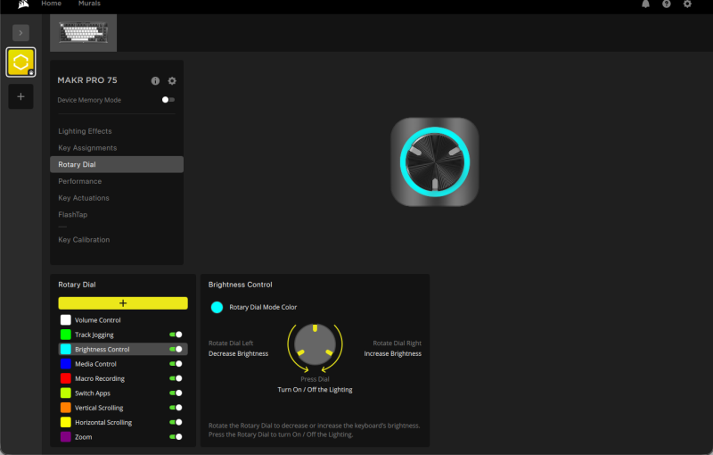 Wszelkie opcje i personalizacje klawiatury możemy wykonać w dedykowanej aplikacji Corsair iCUE, lub na dedykowanej stronie internetowej . Dotyczy to zarówno wspomnianych przełączników jak, oświetlenia klawiatury czy specjalnego pokrętła. Zatrzymajmy się przy nim na chwilę, bo to niezwykle użyteczny element, wyróżniający tę pozycję na tle konkurencyjnych rozwiązań.