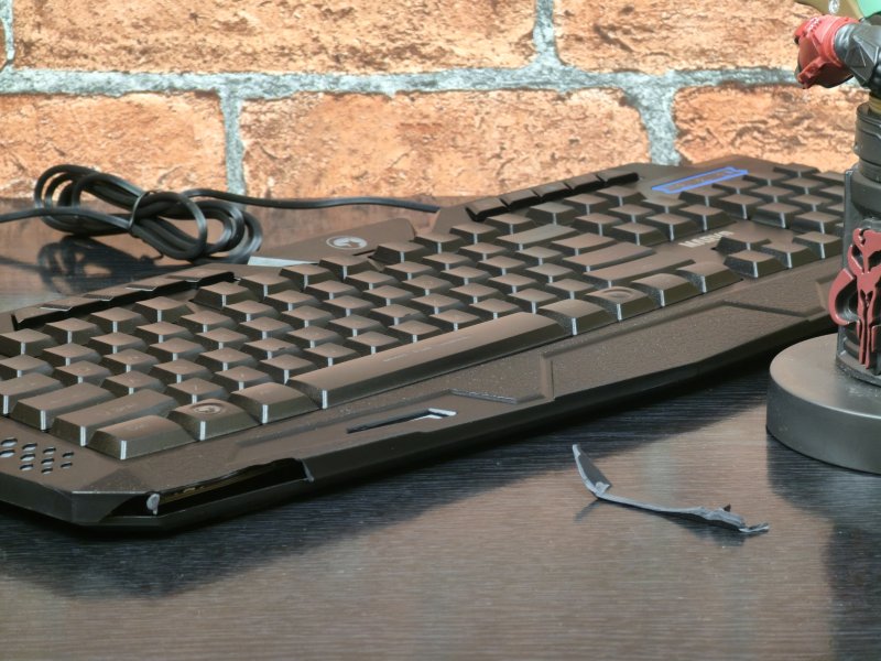 Nowa, nieużywana klawiatura, którą kupiłem i której nie miałem okazji w żaden sposób rzucić czy o cokolwiek obić, nawet w opakowaniu, miała dość istotny defekt. Mianowicie kawałek plastiku z dolnej części oderwał się od urządzenia, do czego najpewniej doszło w transporcie i wbrew pozorom wcale mnie to nie dziwi. Klawiatura ma w opakowaniu tyle pustego miejsca, że jeżeli do kogokolwiek dotarła w jednym kawałku, to można ten fakt postrzegać w kategoriach cudu.
