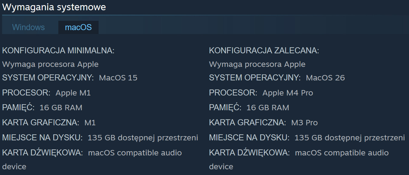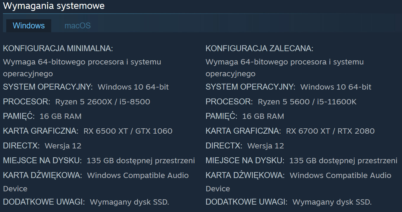 Dziś znamy już dokładne wymagania sprzętowe nie tylko wersji na komputery osobiste z systemem Windows, ale też MacOS. Wygląda na to, że tworzenie gry na własnym silniku, zamiast nadużywanego obecnie Unreal Engine 5, zaowocowały. Minimalne wymagania są zaskakująco niskie, a nawet w zalecanych znalazło się jedynie 16 GB RAM.