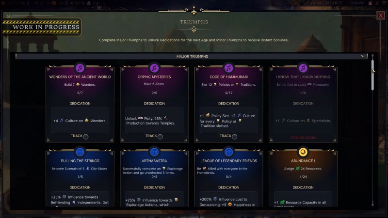 Triumfy można zdobywać zarówno poprzez naturalny rozwój imperium, jak i bardziej nietypowe decyzje strategiczne, co ma sprawić, że każda rozgrywka będzie przebiegać inaczej. Za ukończenie Triumfów gracze otrzymają bonusy dla imperium lub specjalne karty, które będzie można wykorzystać na początku kolejnej epoki, wpływając na dalszy kierunek rozwoju cywilizacji.
