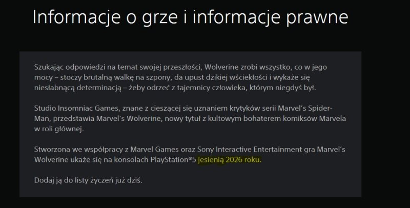 Jak zwykle, Sony trzyma w tajemnicy program całego wydarzenia. Wiele wskazuje jednak na to, że poznamy wreszcie datę premiery długo wyczekiwanego Marvel’s Wolverine. Wydaje się to potwierdzać fakt, że według doniesień graczy z Ameryki Łacińskiej, w meksykańskiej wersji PS Store pojawiła się informacja o premierze tego tytułu w trzecim kwartale 2026 rok. Co więcej, również polska strona sklepu potwierdza tę informację.