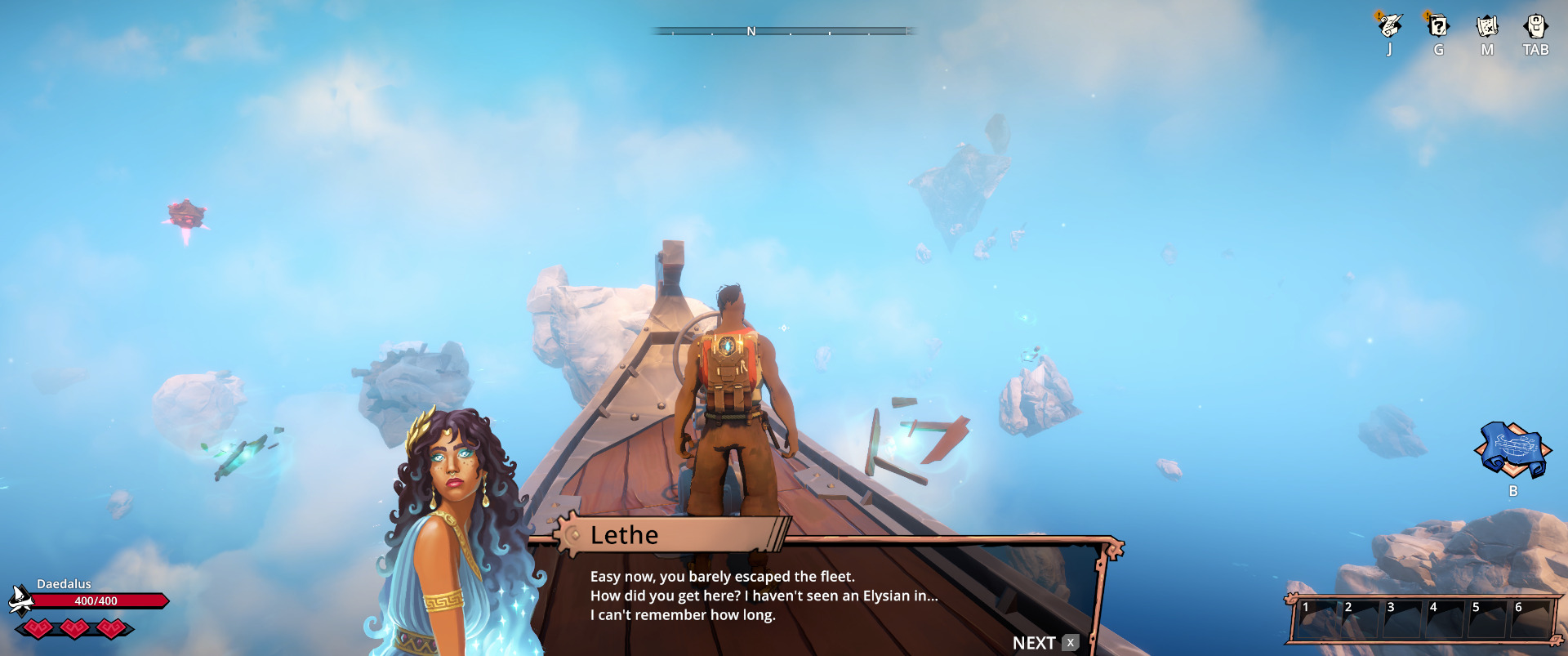 Nie jest to najbardziej porywający początek historii, a sam setting jest ostatnio wyjątkowo popularny. W trakcie zabawy nie czułem się też przesadnie zachęcony do zagłębienia się w lore Elysium. Obecnie tło fabularne stanowi w mojej ocenie jedynie pretekst do tego, żeby pchnąć w kierunku zorientowanej wokół rozbudowy latającego statku — fortecy.