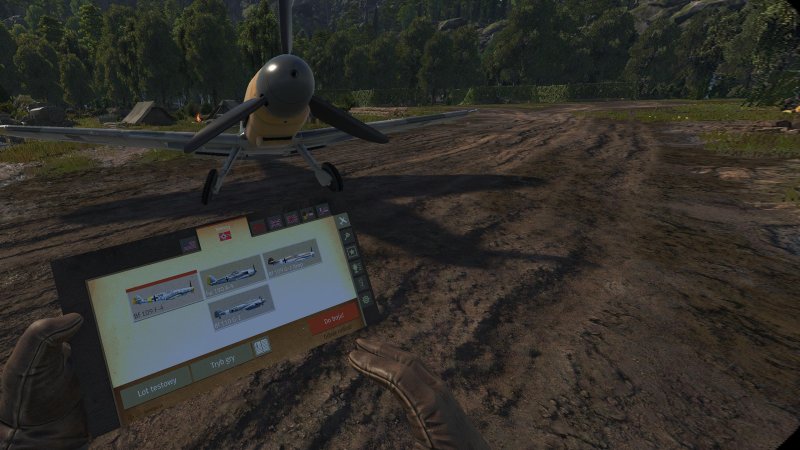 Po założeniu gogli i uruchomieniu gry, jesteśmy od razu wrzuceni na pas startowy z tekturowym menu w ręce, mającym przypominać taktyczną lotniczą mapę. Widzimy możliwe do wyboru maszyny spośród kilku obecnych w grze nacji oraz dostępne tryby rozgrywki.