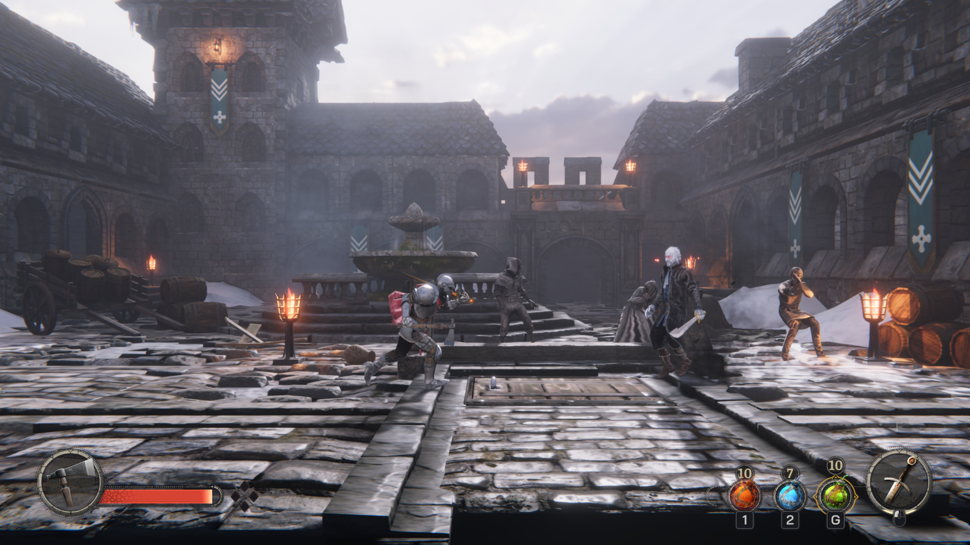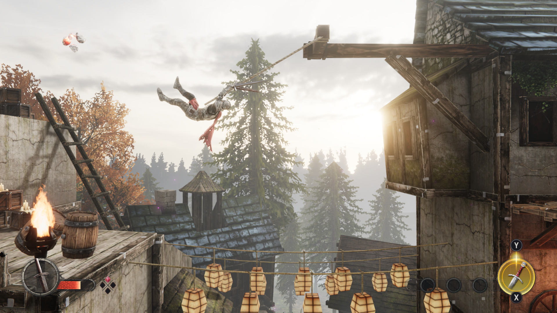 Na papierze wygląda to całkiem nieźle. Mamy atak, blok i unik, oraz ładowany zwykłymi cięciami potężny cios specjalny. Do tego dochodzi uzbrojenie, jakie możemy podnieść jak kusze, topory czy jeden z trzech rodzajów granatów. Animacje ciosów są niestety bardzo drewniane i jest ich niewiele. Bardzo przeszkadzało mi też bardzo dziwna decyzja twórców, wskutek której nieprzyjaciele po kilku razach upadają na ziemię i musimy kucnąć, żeby móc w nich uderzyć. Do samego końca gry nie mogłem się do tego przyzwyczaić.
