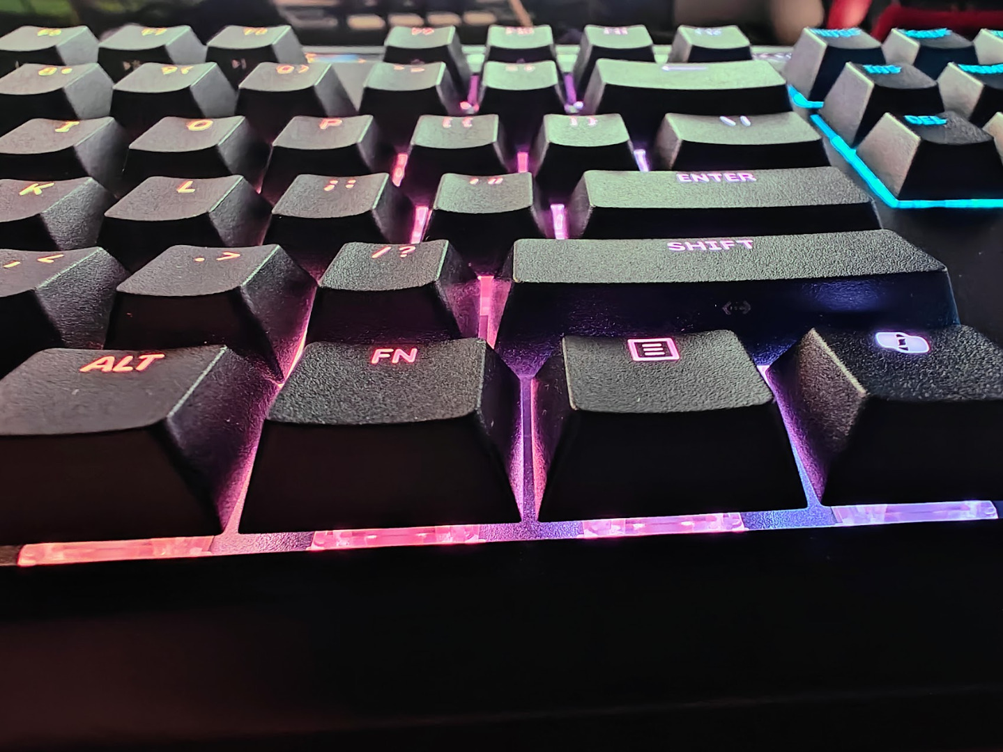 Na pochwałę zasługuje też piękne oświetlenie RGB, które możemy dostosować per klawisz. Kolory są żywe i nasycone. Podczas dnia podświetlenie prezentuje się bardzo dobrze, za to w czasie wieczornych i nocnych sesji potrafi oczarować istnym spektaklem świateł. Nic tylko wziąć kakałko w dłoń i zatracić się w ulubionym wirtualnym świecie.