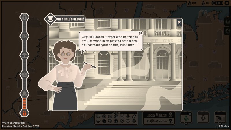 Co tydzień wybieramy również na mapie, którą dzielnicę spróbujemy „przejąć”, poszerzając swoje strefy wpływu. Każda dzielnica jest zainteresowana innymi tematami i żeby wyrobić sobie w niej reputację, a następnie sprawić, by została lojalna, musimy odpowiedzieć na te zainteresowania. Jeśli jednak uda się nam dzielnicę przejąć swoim bezkonkurencyjnym pismem, zostaniemy nagrodzeni lojalnością mieszkańców oraz punktami wpływu.