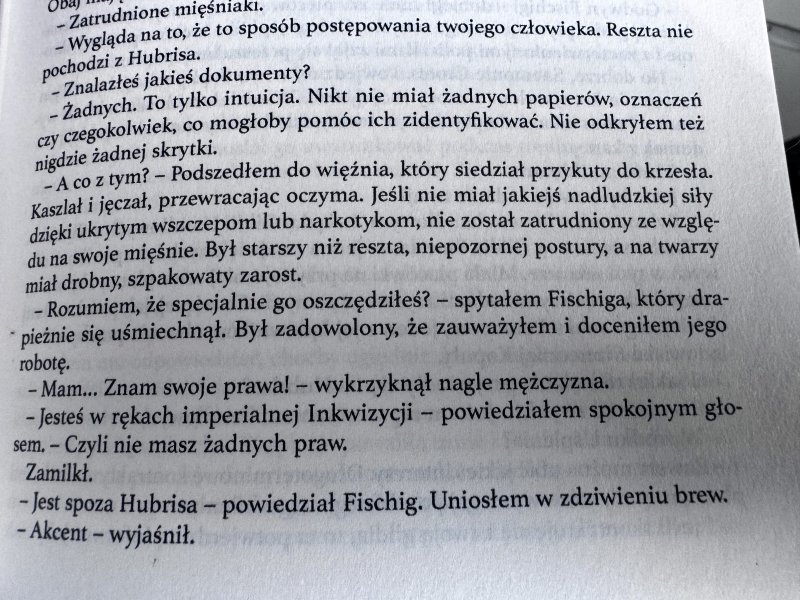 W takich właśnie okolicznościach wykonywanie swojego inkwizytorskiego fachu nie jest zadaniem łatwym, choć z perspektywy czytelnika trudno nie docenić pomysłowości Gregora i jego elastyczności w dostosowywaniu się do okoliczności. Jakie wyzwania przed nim stoją i czy uda mu się wyjść cało z zawirowań wydarzeń, w które zostanie wplątany? Dzieje się tutaj naprawdę sporo, przez co od czytania niezwykle trudno się oderwać!