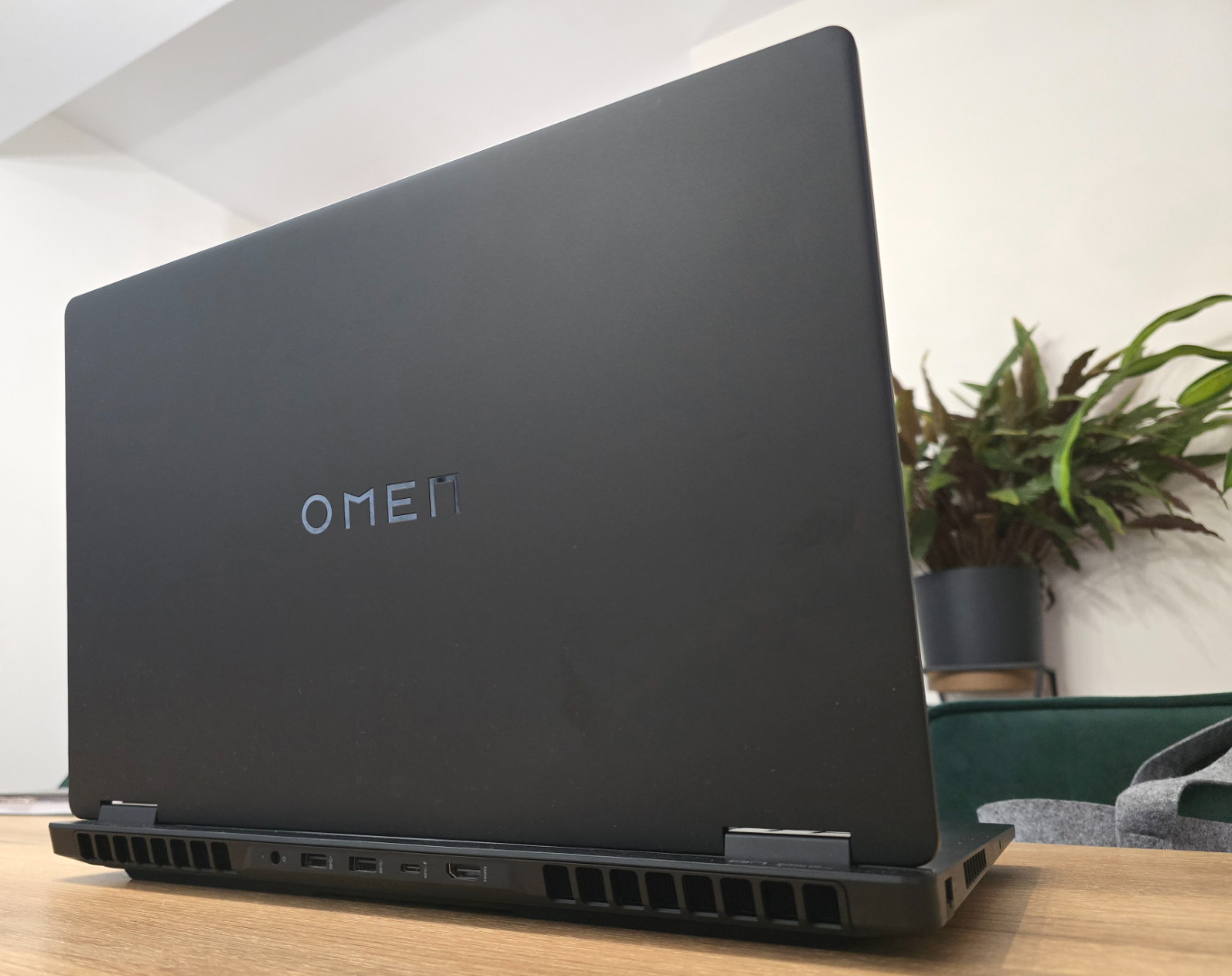 Omen 17 to laptop, który nie ma krzykliwego wyglądu, nie przykuwa uwagi nachalnym podświetleniem RGB i nie posiada obudowy niczym z filmu Sci-fi. Mamy tutaj do czynienia z prostą bryłą, której konstrukcja jest delikatnie zaoblona na rogach i z charakterystycznym napisem „OMEN” na przedniej obudowie. Jakość, użytego do obudowy, plastiku jest bardzo dobra i nie trzeszczy, gdy weźmie się go w dłonie. Pozbawiona ona jest krzykliwych akcentów, dzięki czemu wygląda minimalistycznie i profesjonalnie. Nie ma większego problemu z zostawianiem odcisków palców na powierzchni, co dodatkowo podkreśla elegancję urządzenia.