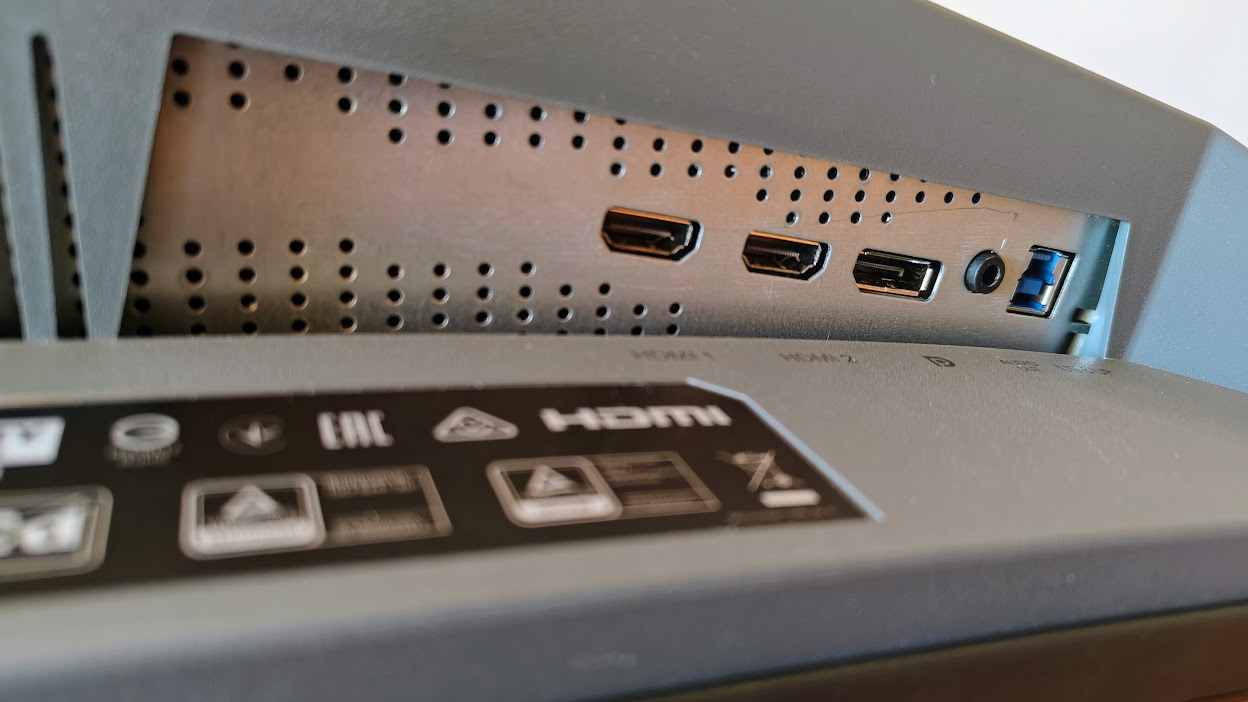 Po drugie, znajdziemy tu dwa złącza HDMI 2.0. Właśnie w tym miejscu odczuwalne jest największe ograniczenie konstrukcji — ze względu na brak standardu HDMI 2.1, maksymalne odświeżanie ograniczone jest do 100 Hz. To szczególnie istotne dla użytkowników konsol obecnej generacji (Xbox Series X|S/PlayStation 5), którzy nie będą mogli pograć w 120 Hz, na jakie pozwalają niektóre gry.
