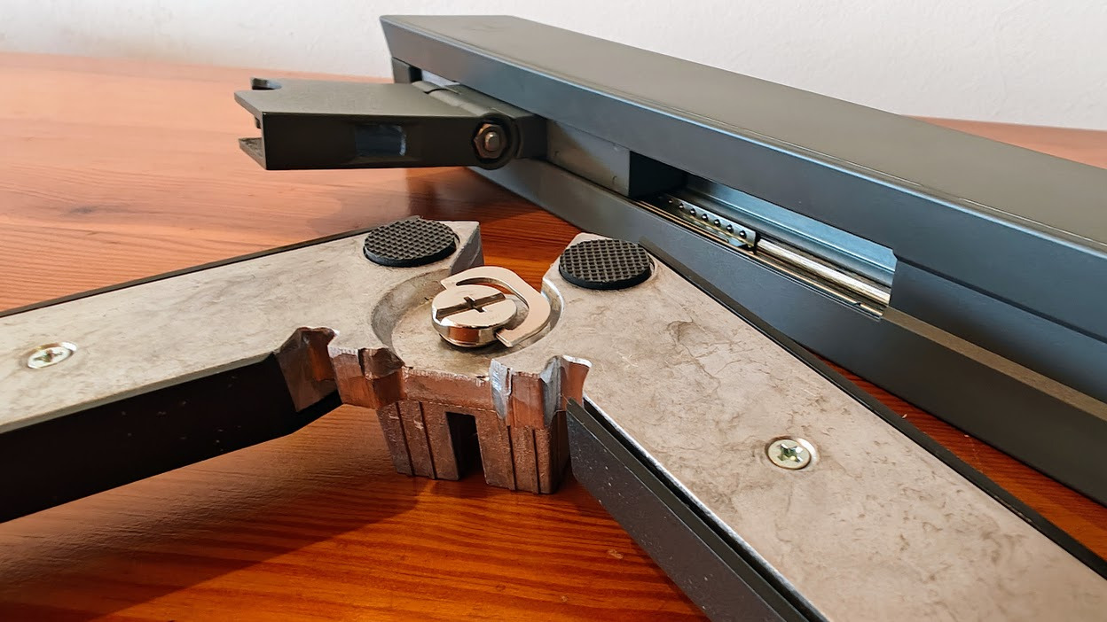 Montaż całości jest szalenie prosty i beznarzędziowy. Podstawę wkręcamy znajdującą się w niej śrubą do ramienia, a następnia całość łączymy ze znajdującym się z tyłu obudowy zatrzaskiem.