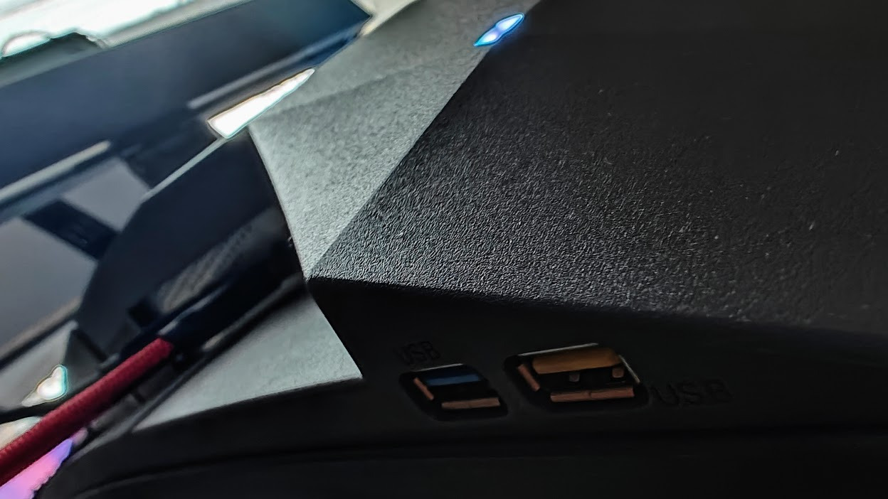 Następnie mamy rzecz, którą uwielbiam i bardzo sobie cenię, czyli hub USB. Jest podzielony na USB typu B, które łączymy z komputerem dołączonym do zestawu przewodem, oraz dwa porty USB, 2.0 i 3.2 Gen. 1, z których jeden oferuje szybkie ładowanie. Złącza USB dostępne właściwie pod ręką, to funkcja szalenie przydatna w codziennym użytkowaniu, dzięki której nie tylko nie musimy szukać wolnych miejsc z tyłu obudowy, ale też możemy, na przykład, podłączyć odbiornik do naszych bezprzewodowych peryferiów i zmniejszyć ewentualne zakłócenia.