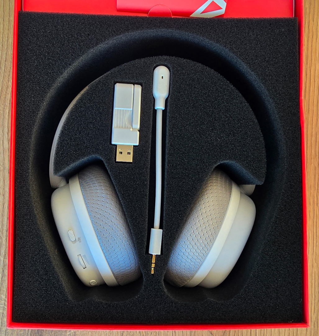Zacznijmy od tego, że omawiane słuchawki oferują naprawdę szeroki zakres łączności z komputerem i smartfonem. W zestawie otrzymujemy adapter, a same słuchawki posiadają również możliwość połączenia przez Bluetooth (BT 5.2). Najlepszym sposobem jest jednak korzystanie z adaptera, który można wpiąć do komputera poprzez USB A, lub USB C, a deklarowany zasięg to aż 10 metrów. Połączenie słuchawek przez adapter oferuje najmniejsze opóźnienia i najwyższą jakość dźwięku. Osobiście napotkałem spore problemy z łącznością już przy 5 metrach. Bateria wytrzymuje około 10 godzin korzystania, a samo ładowanie trwa około godziny.