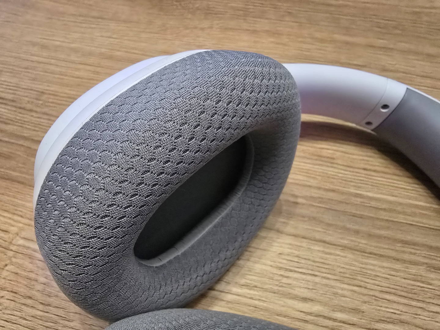 Za wyciszenie słuchawek odpowiada materiałowa powłoka, która spisuje się całkiem dobrze i jest miła w dotyku. Chociaż początkowo bałem się, że będzie się zaciągać o okulary lub szybko się pobrudzi, to moje obawy okazały się bezpodstawne. Przez ponad miesiąc korzystania ze słuchawek, z materiałem nic się nie stało, nie brudzi się, a co najważniejsze, skóra się nie poci nawet podczas długiego noszenia.