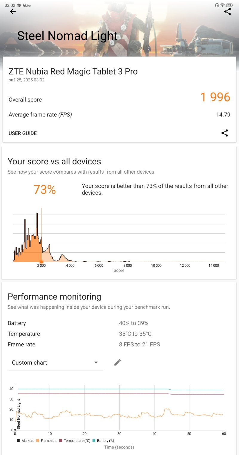 Benchmark Steel Nomad Life nieco nadwyrężył urządzenie, ale i tak Redmagic osiągnął wynik lepszy, niż 73% sprawdzanych tym testem urządzeń. Szczegóły rzecz jasna w zrzucie ekranu poniżej.