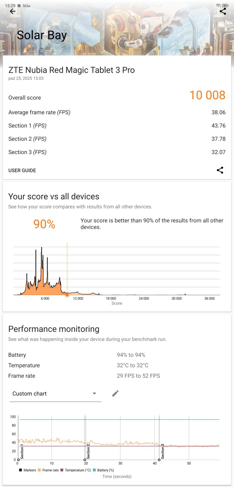 Solar Bay Stress Test z kolei aż tak łaskawy nie był i choć tablet osiągnął bardzo dobre wyniki punktowe, tak na wykresie widać, że wraz ze wzrostem temperatury, Redmagic Astra miał coraz większe problemy z utrzymaniem stabilności.