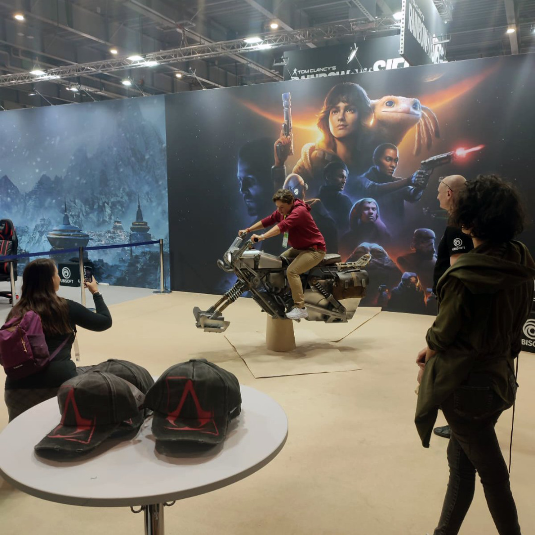 Rafał: W hali nr 7 poza wyśmienitymi pokazami Plaion Polska, swoje stanowiska miał także Ubisoft. Co przygotowano dla odwiedzających? Przede wszystkim najnowszą produkcję Star Wars Outlaws. Tytuł był już recenzowany przez naszą redakcję — Recenzja: Star Wars: Outlaws, ale jako iż sam nie miałem okazji wcześniej zagrać, to założyłem słuchawki, skoczyłem po pada i wziąłem się za granie. Ubi przygotował całkiem sporo, bo prawie 20 stanowisk z tym tytułem i zainteresowanie było niemałe! ? Jako dodatkową atrakcję, można było zrobić sobie fotkę na kosmicznym ścigaczu i zgarnąć parę drobnych fantów.