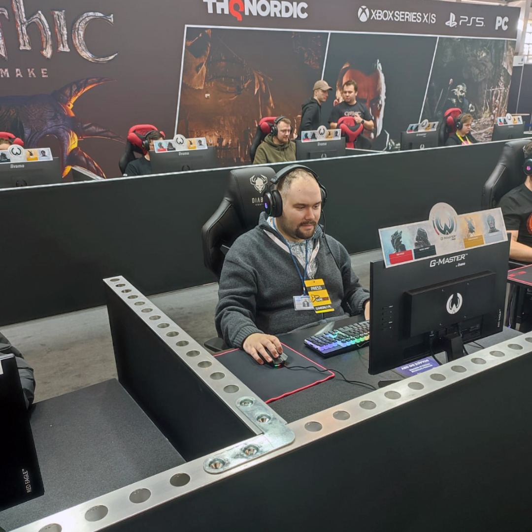 Później podskoczyliśmy do Plaion Polska. Zasadniczo w celu zagrania w Gothic Remake oraz Kingdom Come Deliverance 2, ale nie tylko... Przede wszystkim chcieliśmy w końcu pierwszy raz zobaczyć się z szefem marketingu Plaion, czyli Mikołajem Dusińskim, z którym ja znam się już naprawdę długo i udało się przybić piąteczkę! Później oczywiście dorwaliśmy się do samych gier. Rafał zagrał w Kingdom Come Deliverance 2, a ja zarówno w niego, jak i w samego Gothica.