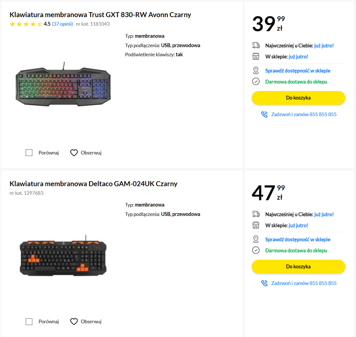Przeglądając oferty sklepów i patrząc na najtańsze spełniające wymagania klawiatury, w przedbiegach odpadł Media Expert w tym zakresie. Najtańsza kosztowała tam bowiem 69 złotych, jednak ten model Redragona w żaden sposób nie krzyczał „tylko dla graczy”. Podobnie rzecz miała się z x-kom, MediaMarkt oraz Allegro, gdzie po prostu nie znalazłem niczego dostępnego natychmiast i na interesującym mnie pułapie cenowym.
