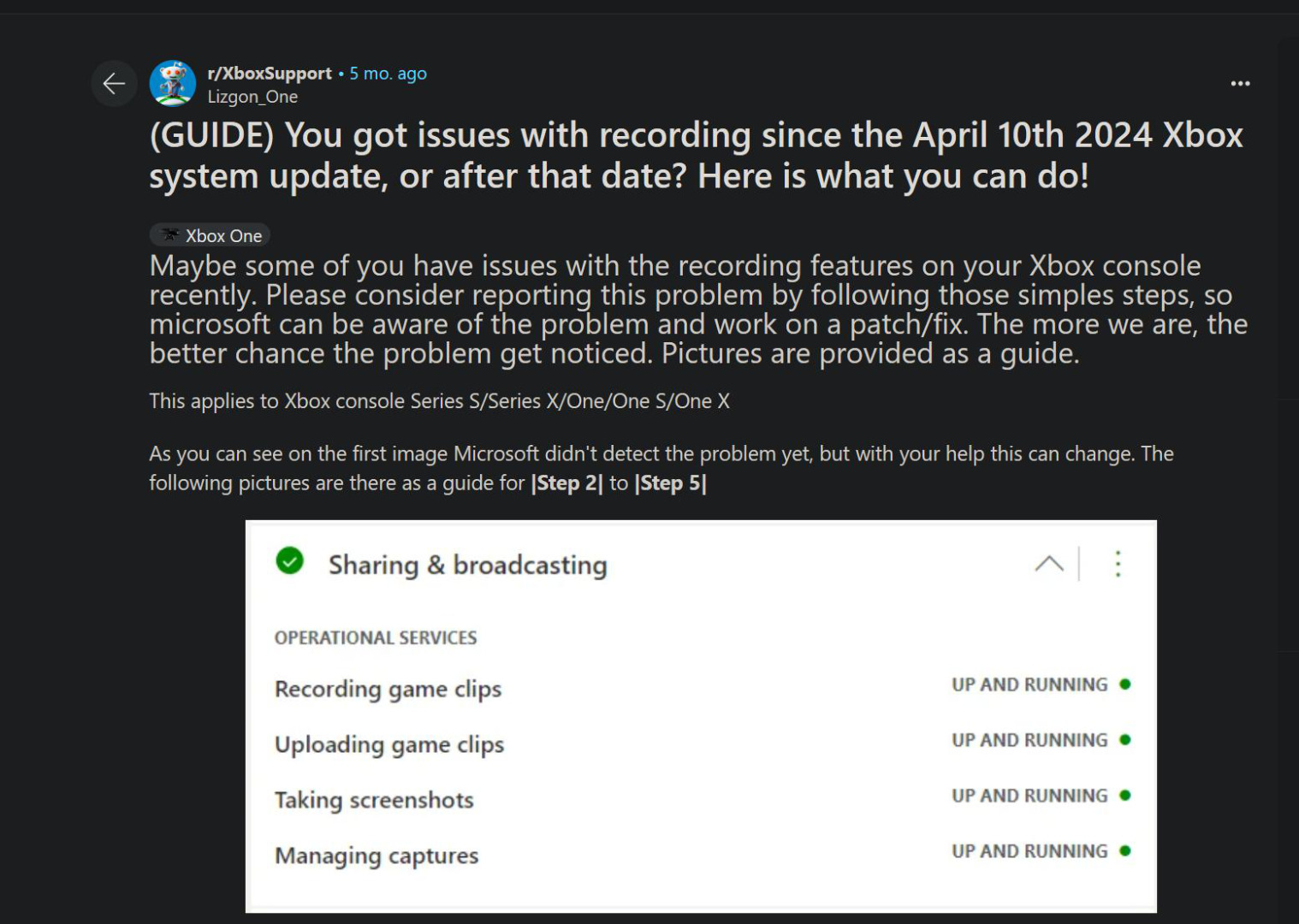 Wydawałoby się, że tak poważny błąd powinien zostać poprawiony już dawno, a jednak nie został. W chwili publikacji tego artykułu (6 września 2024) nic się nie zmieniło, a nagrania na Xbox dalej powstają uszkodzone. Internauci zarówno na portalu Microsoft Answers jak i Reddit wciąż proszą o naprawę buga i wylewają na producenta swoje żale, ale niewiele to daje.