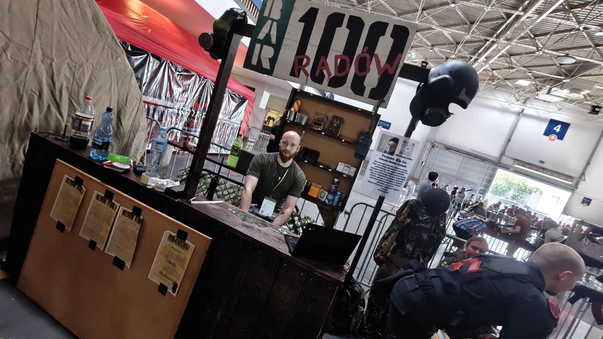 W końcu dotarliśmy do baru 100-Radów, którzy znają chyba wszyscy fani tego Słowiańskiego tytułu. Przyznam, że chłopaki zadbały tam o wystrój. Klimat STALKER-a dosłownie lał się strumieniami i to wcale nie z butelek wódki "Kozak" obecnej w tytule, a za sprawą całego wystroju. Zadbano o odwzorowanie namiotów wojskowych z serii, czy nawet replik broni GP-37, jak i kultowego działa Gaussa. ? Takie przywiązanie do detali szanujemy, a każdy fan tej genialnej strzelanki bezapelacyjnie powinien tam postawić swą doświadczoną anomaliami stopę.