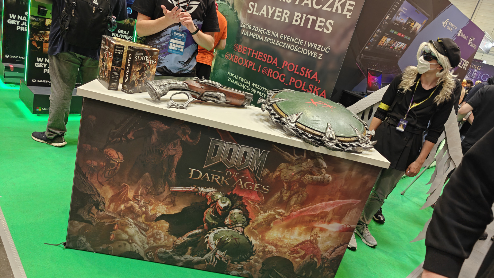 Następnie szybkim krokiem udaliśmy się na stoisko Bethesdy, gdzie można było nie tylko zagrać w najnowszego Dooma, ale i zrobić sobie fotę z kultową tarczą Slayera i shotgunem w dłoni, czy nawet zgarnąć opakowanie płatków Doom Slayer. Przyznaję, kupili mnie tym jak paczkę żelków, więc śmiało zrobiłem selfika, żeby zgarnąć chrupki, a i zapozowałem do zdjęcia dzierżąc tarczę Slayera. Było naprawdę fajnie!
