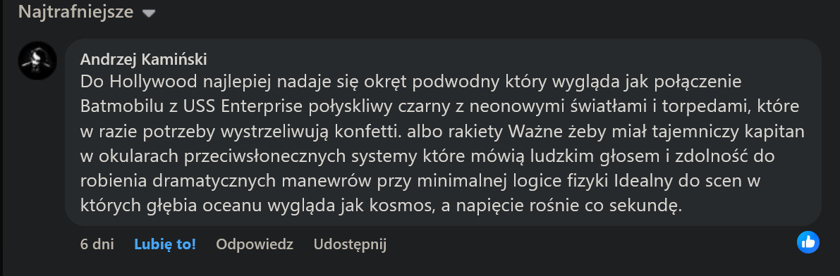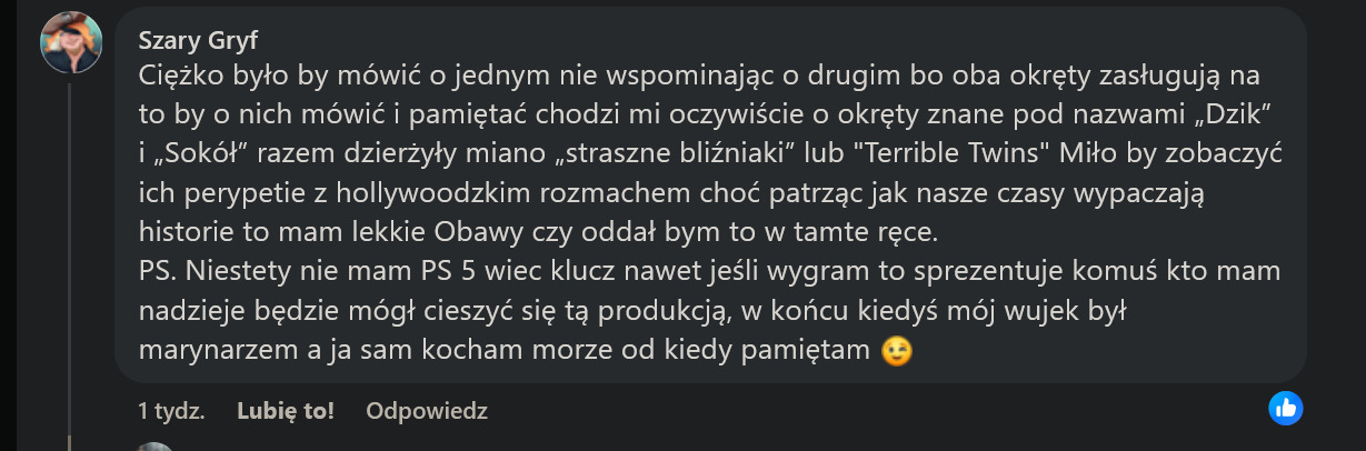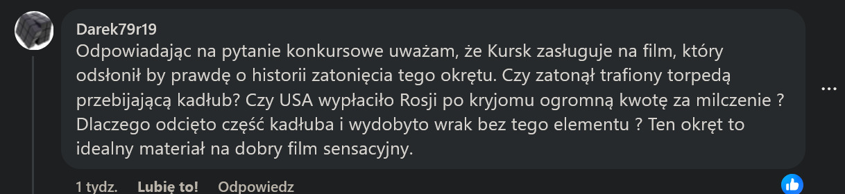 Darku, jak widać nie trzeba wiele tekstu, by postawić wiele trafnych pytań, a do tego wprowadzić do umysły czytających aurę tajemnicy razem z głodem wiedzy! Czy Kursk to oczywista odpowiedź? Tak, ale nikt inny jej nie podał, a ten okręt jak mało który zasługiwałby na następny film z jego udziałem. Śmiało trzymaj więc kopię UBOAT na PS5 i baw się dobrze! ?