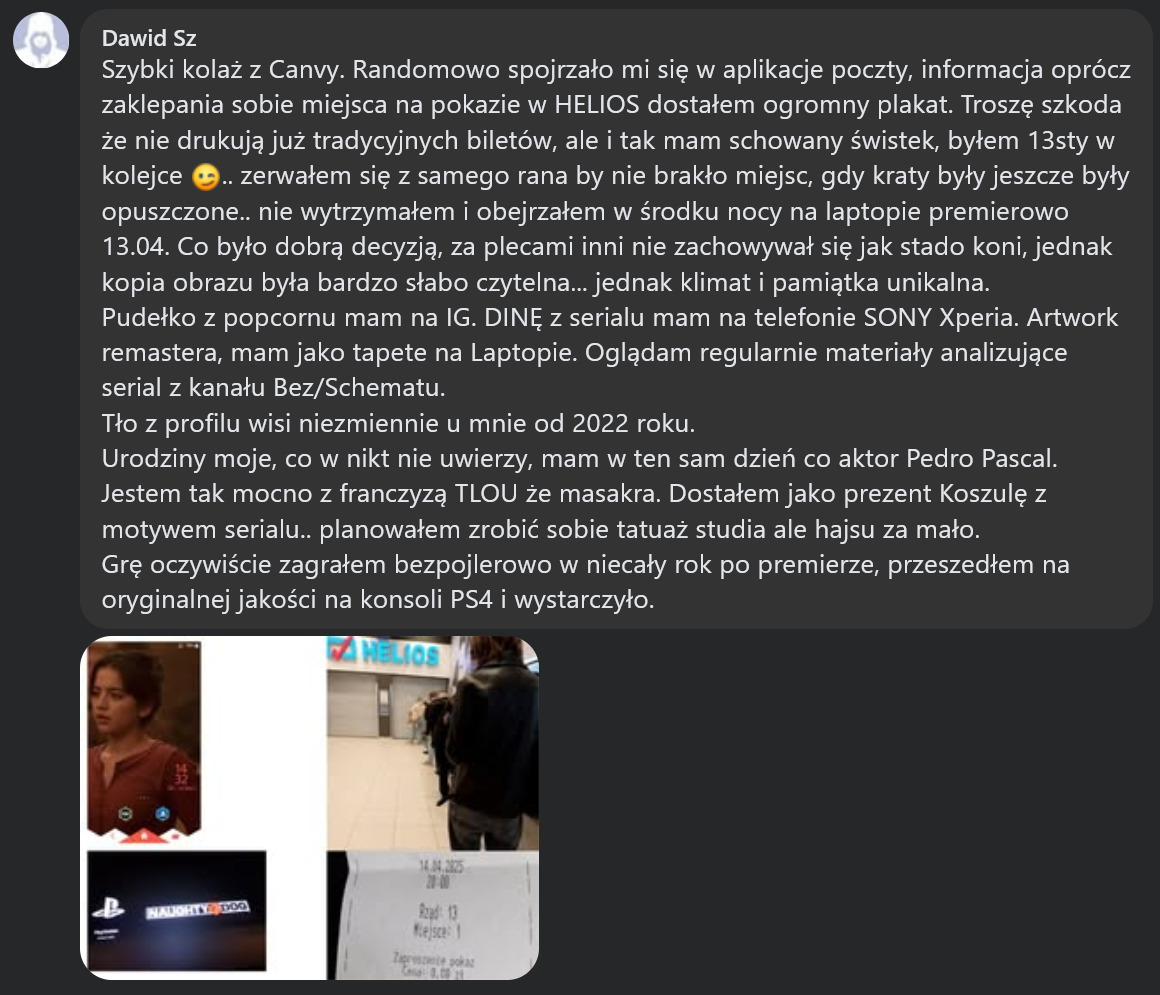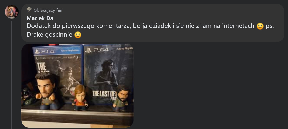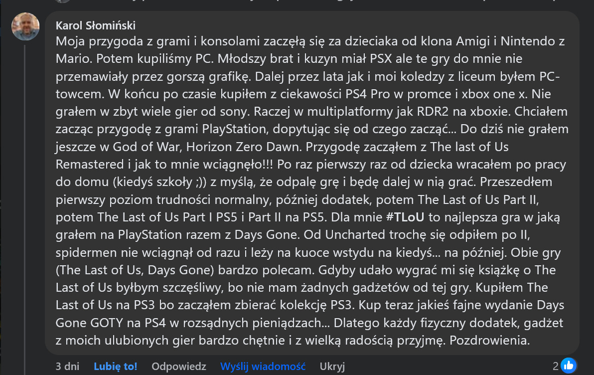 Dawidzie, jesteś prawdziwym fanem TLOU! Nie tylko świetnie dałeś nam znać dlaczego, to ty właśnie powinieneś otrzymać książkę, ale do tego także znakomicie to udokumentowałeś i włożyłeś w to sporo pracy. Dlatego książka wędruje do Ciebie! ?