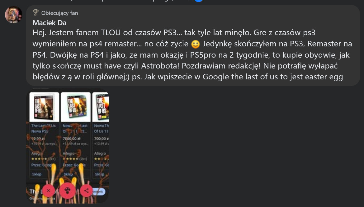 Podium zamknął Maciek, czyli jedna z pierwszych osób, która wzięła udział w konkursie i nie tylko świetnie umotywował swój wpis, ale i dał nam znać o fajnym easter eggu na Google, o którym nawet nie mieliśmy pojęcia! Sprawdziliśmy i potwierdzamy, jeśli w Google wpiszcie The Last of Us... to na ekranie wyrosną grzyby. ? Jesteś prawdziwym fanem TLOU i książka wędruje do Ciebie! ?