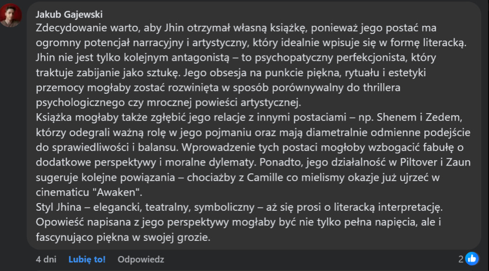 Tutaj chyba nie musimy nawet dodawać komentarza. Kuba włożył mnóstwo serca w swoje zgłoszenie, dogłębnie opisał swój pomysł i widać, że jak mało kto zna się na lore League of Legends. Książka Ambessa: Wybrana Przez Wilka wędruje więc do Ciebie! ?