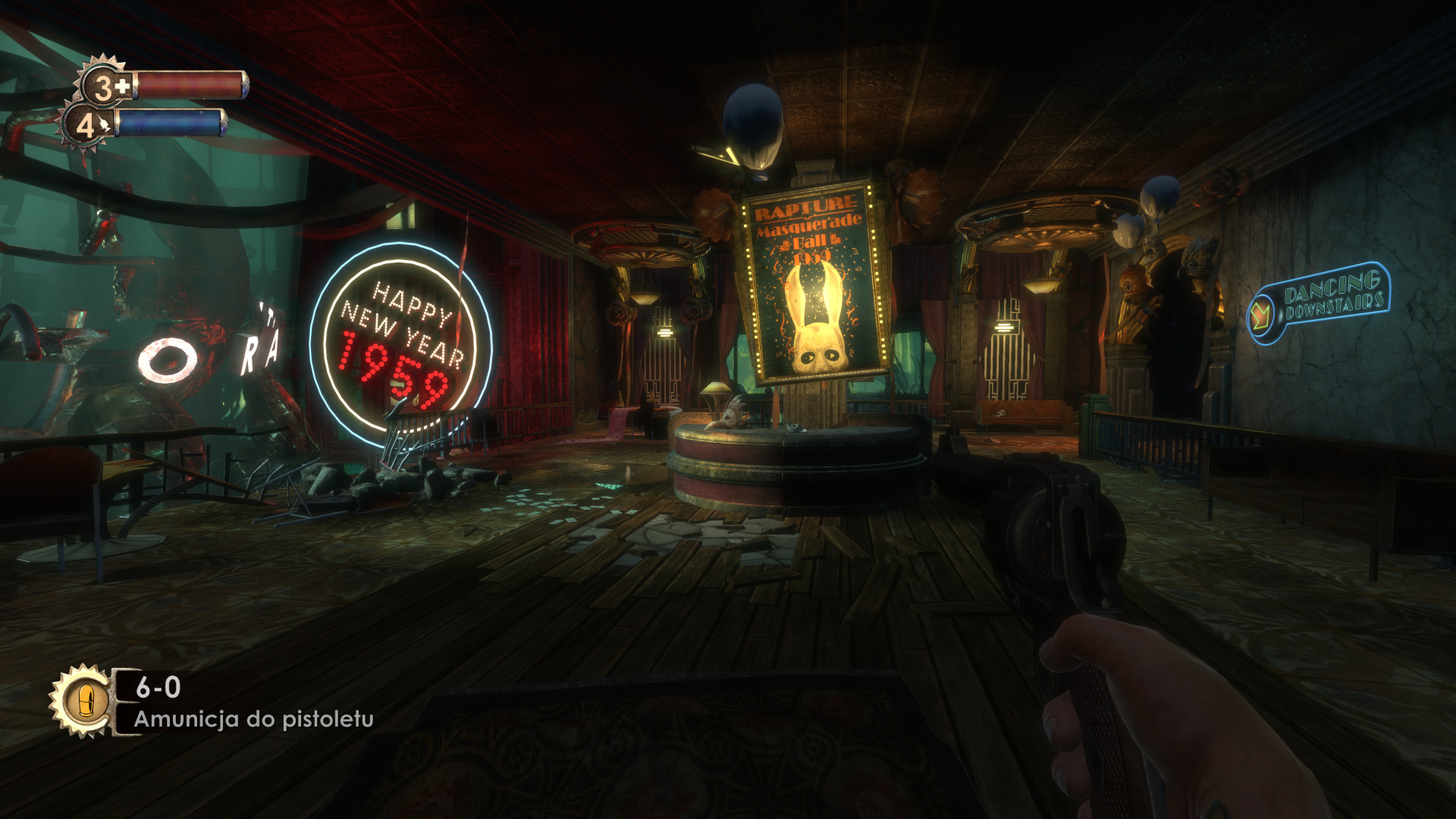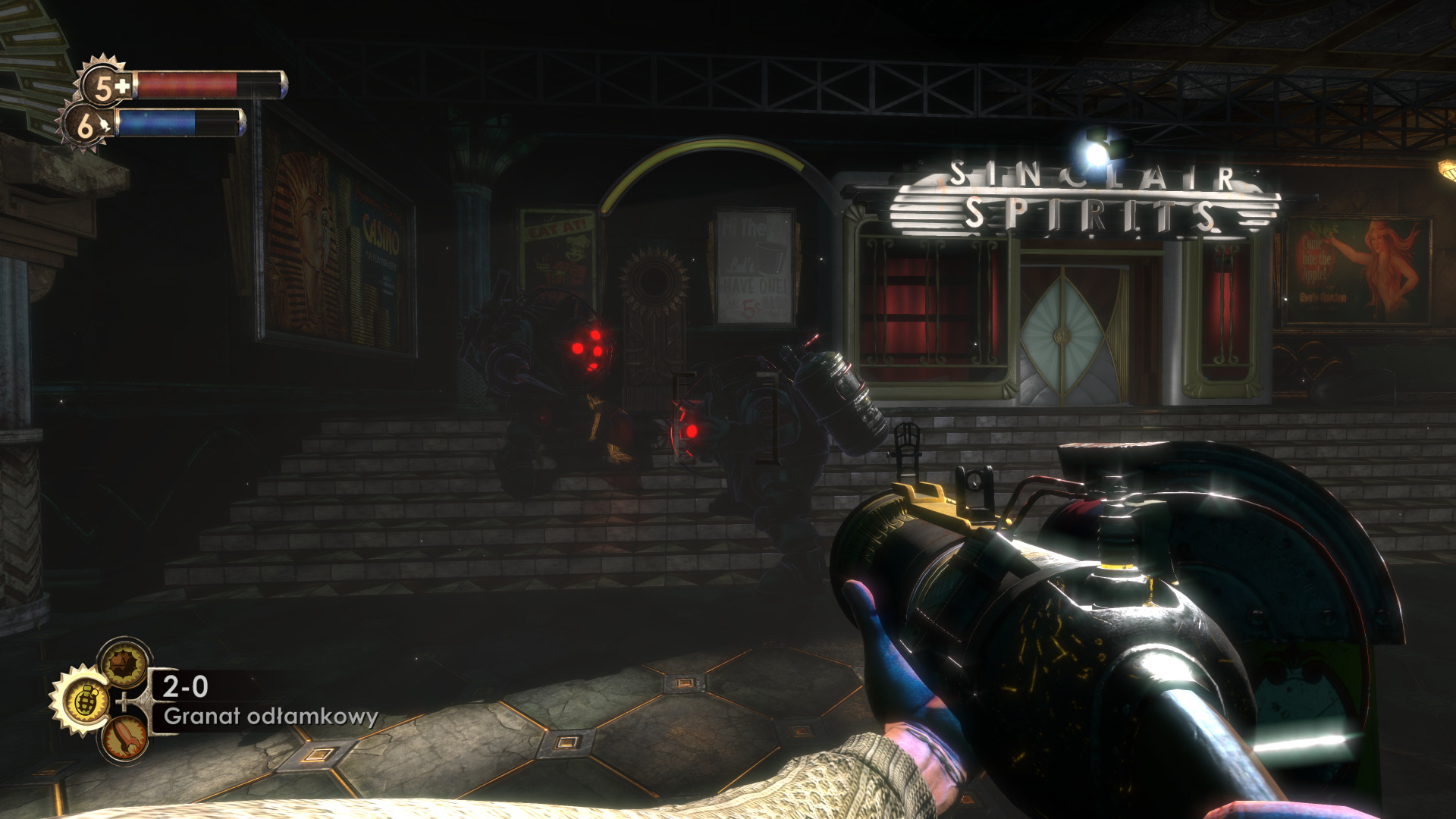 Swoją recenzję gry "Bioshock" zacznę od oceny grafiki. Wspomnę jeszcze tylko o tym, że gram w wersję Remastered z zainstalowanym spolszczeniem. Choć pierwsza część "Bioshocka" posiadała polską, kinową wersję na PC, to w remasterze już o to nie zadbano. Muszę przyznać, że gra prezentuje się bardzo ładnie i klimatycznie. Design gry jest wciąż żywy i dobrze zniósł upływ lat, choć widać pewne archaizmy w teksturach czy modelach otoczenia, to jest naprawdę przyzwoicie. Ogromne wrażenie wywołała u mnie woda, która w "Bioshocku" wygląda bardzo ładnie i nadaje wyraz elementom, które są wystawione na jej działanie. Równie dobrze eksponowane są wszelkie neony czy większe źródła światła nadające klimat tej produkcji. Zadbano także o dobre modele używanej broni. No może poza karabinem, który kompletnie mi się nie podoba i jakoś brak mu wyrazu. Pochwalić jednak muszę strzelbę, która w mojej opinii, jest najbardziej dopracowaną bronią w grze. Szczegółowość modelu i jej wygląd, bardzo przypadły mi do gustu i z miejsca stała się moją ulubioną giwerą w "Bioshocku". Reszta uzbrojenia jest wykonana poprawnie i nie kłuje w oczy. Doczepić mógłbym się trochę do modelu przeciwników, którzy często wyglądają jak by byli ciosani z drewna i kontrastują ze światem przedstawionym, ale mimo to, jakoś dziwnie do niego pasują... Pasują na tyle mocno, że śmiem twierdzić, iż właśnie tak miało to wyglądać. Podwodne miasto Rapture do dziś potrafi wywołać zachwyt i wgnieść w fotel swoim klimatem.