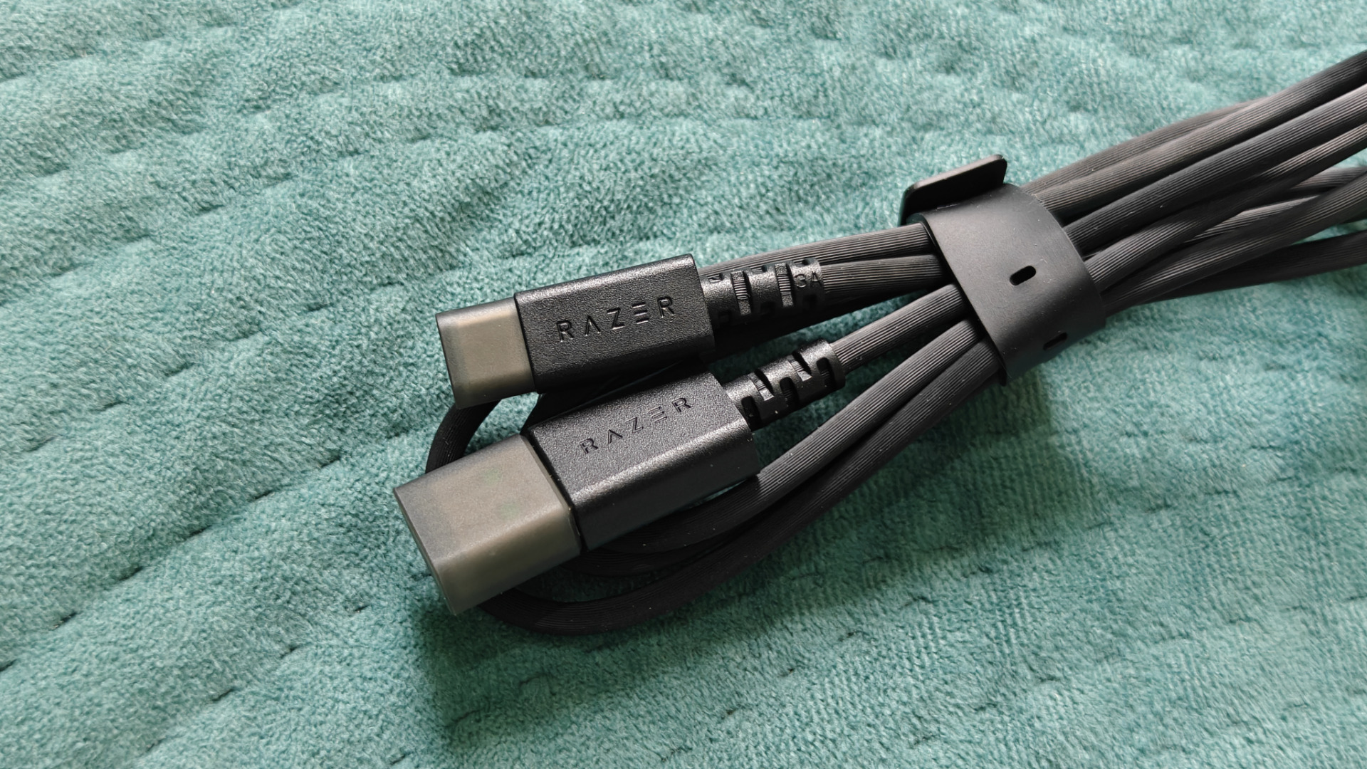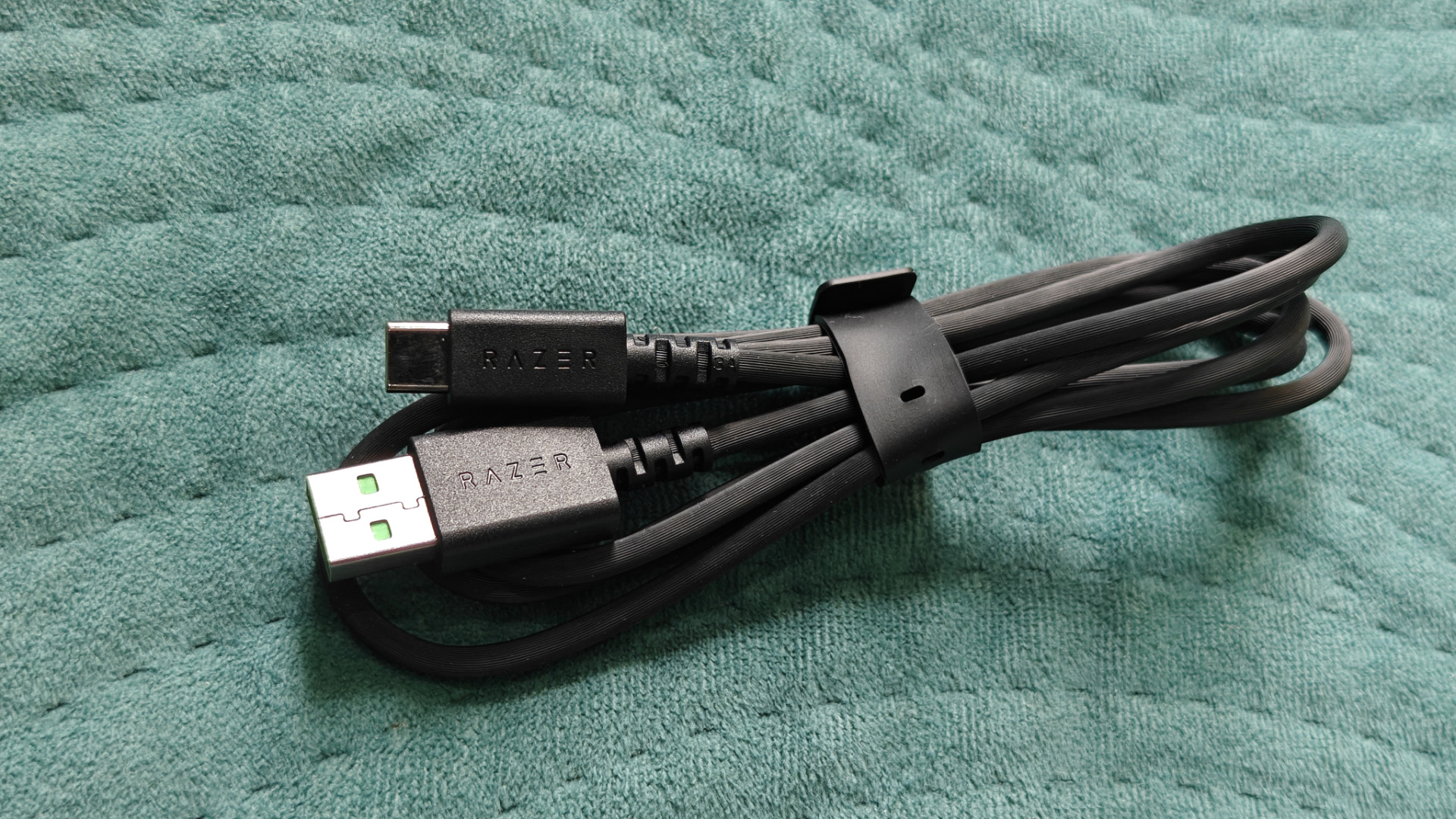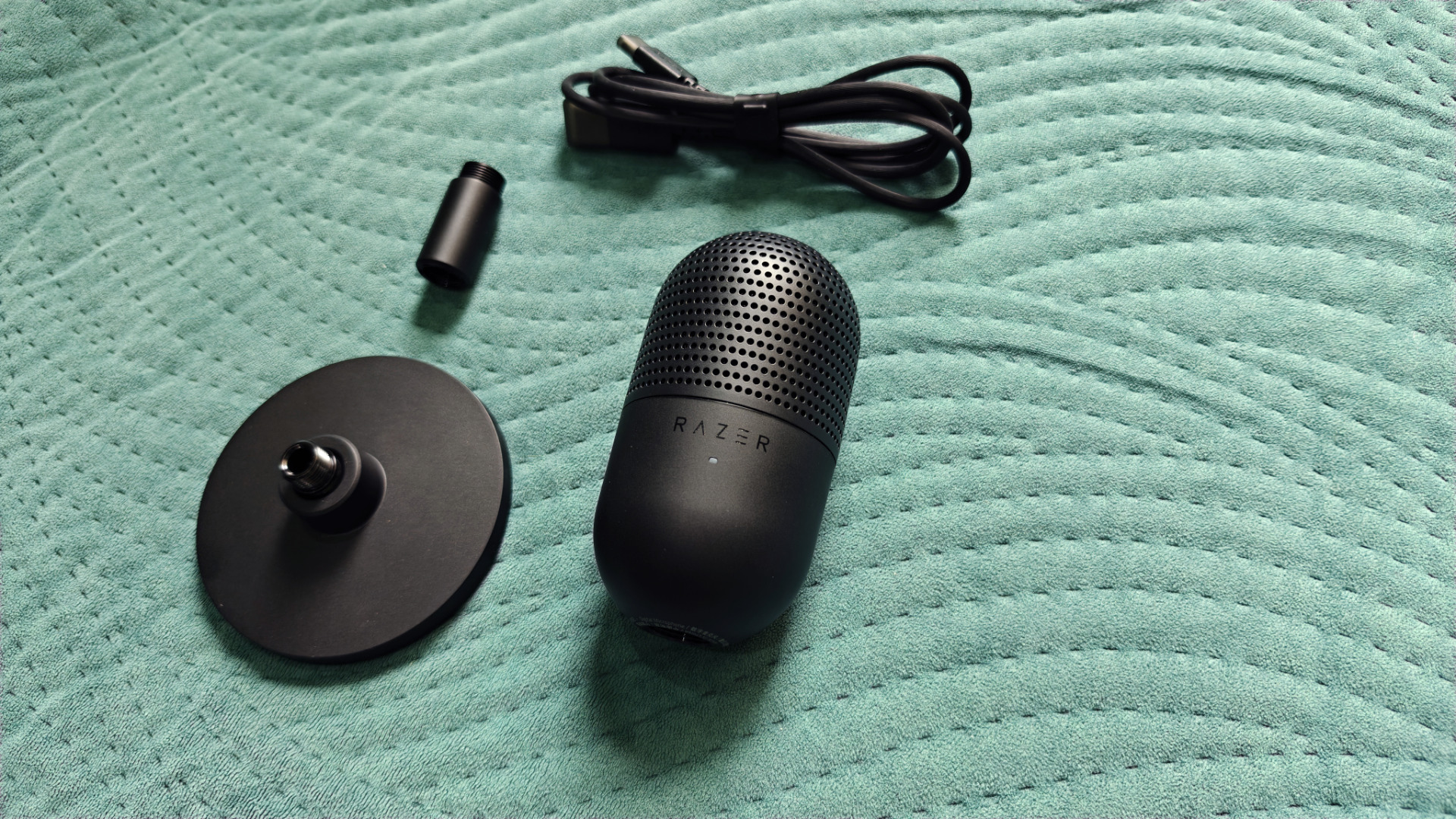 To, że mamy do czynienia z czymś więcej niż tylko zwykłym mikrofonem zwiastuje też sam kabel USB-C. Większość producentów wkłada do pudełek po prostu randomowe kable, jakich na rynku wiele. Razer natomiast zdecydował się zamówić wykonany specjalnie dla niego kabel z przełoczeniami RAZER, zatyczkami na obu końcach (eleganckie) oraz nawet... zielonym kolorem wnętrza samego portu USB! Oplot również wygląda na wyjątkowo wytrzymały. Przypominam, że mikrofon kosztuje leciutko powyżej 210 złotych, więc tak fajny dodatek, to niemałe zaskoczenie.