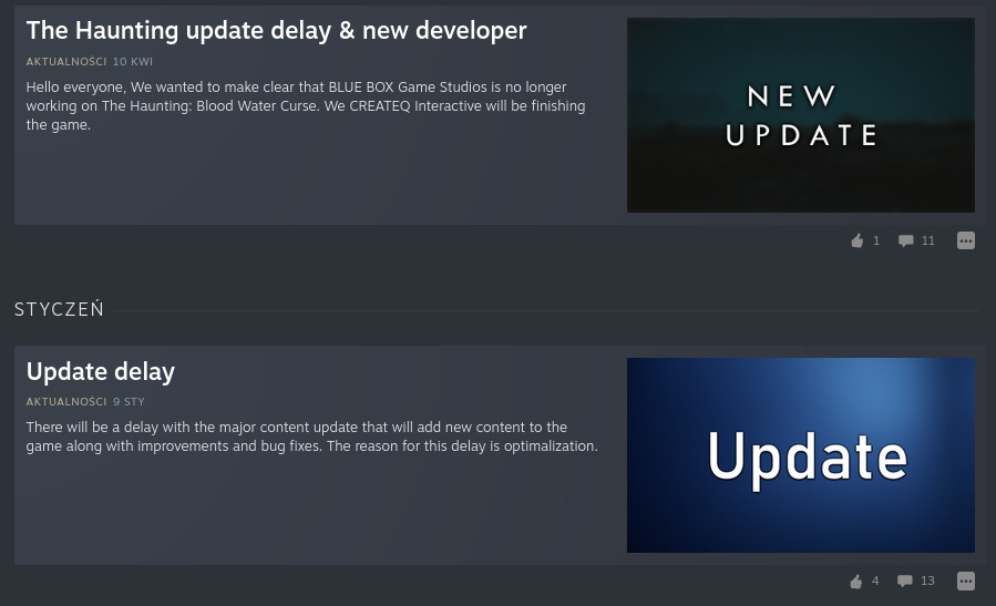 Wygląda więc, że to nie Kojima stoi za wszystkim, a to sam Hasan budował atmosferę, dzięki której mielibyśmy w to wierzyć. Nie jest to zresztą pierwsza gra z którą ma problem, na PS Store znajdziemy chociażby THE HAUNTING: Blood Water Curse (EARLY ACCESS), którego historia na Steamie wygląda podobnie - mnóstwo zapowiedzi aktualizacji i późniejsze ich przesunięcia.