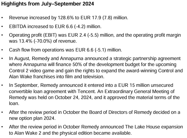 Oto główne punkty z raportu biznesowego Remedy Entertainment za trzeci kwartał 2024 roku: