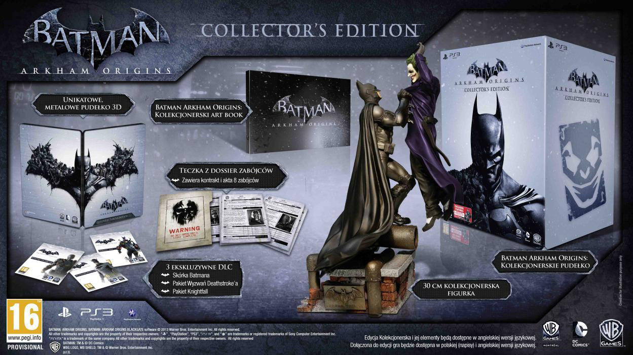 Warner Bros ujawnił zawartość edycji kolekcjonerskiej Batman: Arkham Origins, która już oficjalnie trafi na półki europejskich sklepów w wersji na Xbox 360 i PlayStation 3. Z niewiadomych powodów zestaw nie będzie dostępny dla WiiU. Za 400 zł otrzymamy trzydziesto-centymetrową figurkę Batmana i Jokera, wypchany po brzegi grafikami koncepcyjnymi artbook, dodatkowe skórki dla Batmana i Deathstroke'a. papierowe charakterystyki wrogów Nietoperza, oraz stylowe pudełeczko na grę.