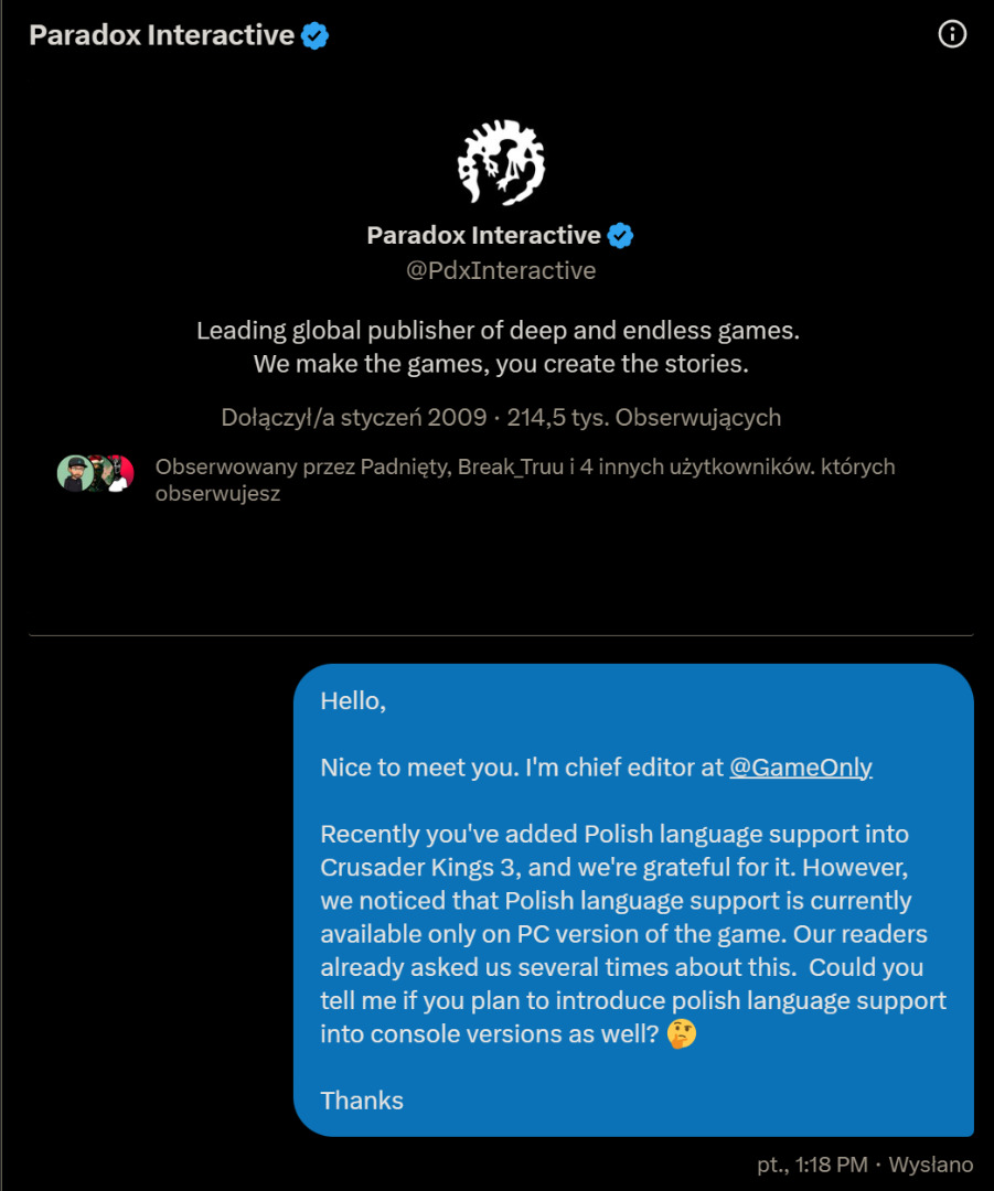 Wiemy jak ważna jest dla Was ta sprawa więc nie przestawaliśmy drążyć. ? Czekaliśmy czekaliśmy i w końcu się doczekaliśmy! Polski wydawca gry drążył tego zagranicznego, aż w końcu otrzymał odpowiedź, którą nam przekazał. Możemy oficjalnie potwierdzić, że Paradox Interactive planuje dodać obsługę języka polskiego w konsolowej wersji Crusader Kings 3 pod koniec 2025 roku.