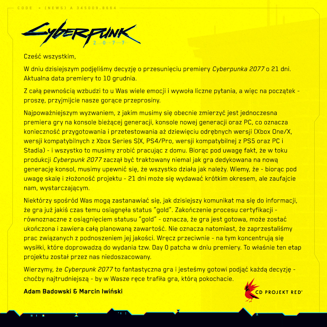 Cóż, twórcy Cyberpunka 2077 przedefiniowali dziś to określenie i okazuje się, że "złoty" status oznacza, że gra jest grywalna, że można ją przejść, ale można też przesunąć jej premierę. Niby nie dużo, bo do 10 grudnia (a więc raptem 21 dni). Powód? Oczywiście chęć doszlifowania produktu na wszystkie platformy. Zdecydowanie chodzi jednak o coś więcej niż tylko jeden czy dwa bugi - gra ma ich zapewne nadal kilkaset.