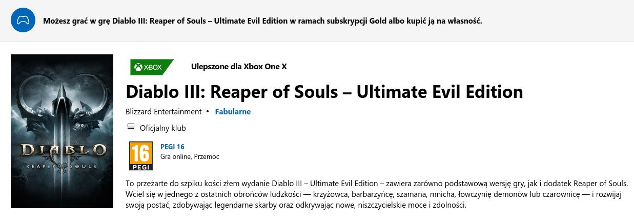 Osoby które pobrały grę zaznaczają jednak, że nie zostaje ona przypisana do konta tak jak inne gry w ramach Games With Gold (w przeciwieństwie do PS+ zostają one na zawsze), a tym razem gra dostępna jest bardziej tak jak w ramach abonamentu Game Pass. Być może taki jest właśnie zamysł Microsoftu, aby teraz abonament Gold stał się wersją uproszczoną pełnego abonamentu. Skoro nie jest on wymagany do gry online, najlepiej byłoby przekonwertować go graczom do pełnej wersji - niestety Microsoft tutaj ma pewien problem, bowiem posiadacze Xbox All Access zapłacili zarówno za Game Passa jak i Golda, na 24 miesiące. Jakiekolwiek zmiany i konwertowanie mogły by łamać umowę i stać się podstawą do zwrócenia xboxów czy nawet batalii sądowych, łatwiej może być więc dodać kolejne gry spoza Game Passa. Kto wie, może Diablo 3 jest pierwszą taką produkcją. A może to zwykła pomyłka jakiegoś pracownika...