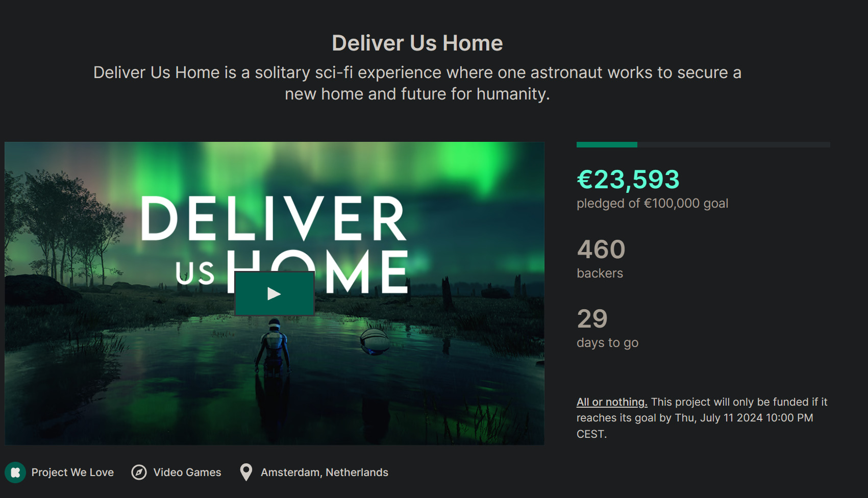 Jeśli chcecie wesprzeć twórców to możecie zrobić to na stronie poświęconej Deliver Us Home w serwisie Kickstarter . Deweloperzy przygotowali mnóstwo opcji wsparcia, od skromnych 10 euro uprawniających do znalezienia się w "creditsach", po pakiet specjalny obejmujący podróż do studia i spotkanie z deweloperami.