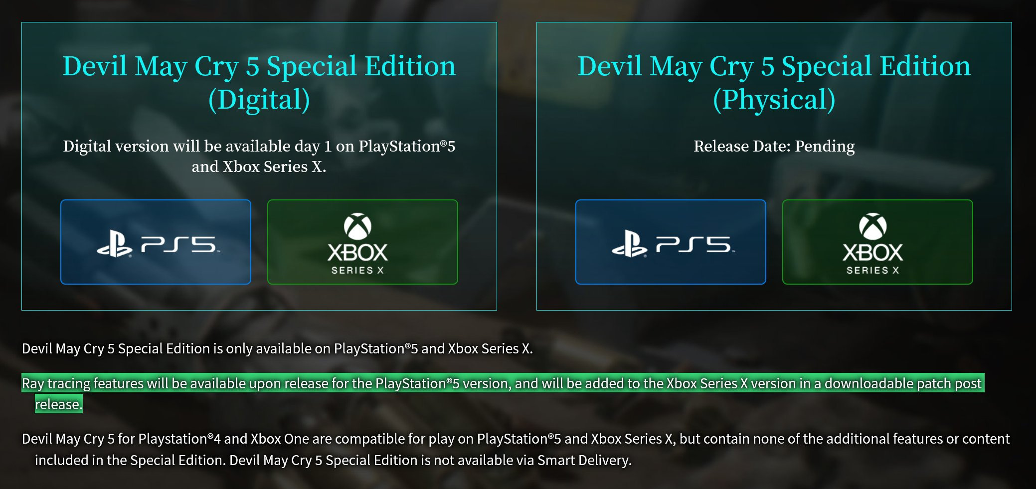Ostatnia ważna informacja w sprawie gry - jeśli macie Devil May Cry 5 z obecnej generacji, to owszem, gra odpali się na next-genach, ale bez zawartości i ulepszeń ze Special Editon. Gra nie jest więc dostępna w ramach Smart Delivery (mając grę na Xbox One dostajesz jej lepszy odpowiednik na Xbox Series przez patchowanie).