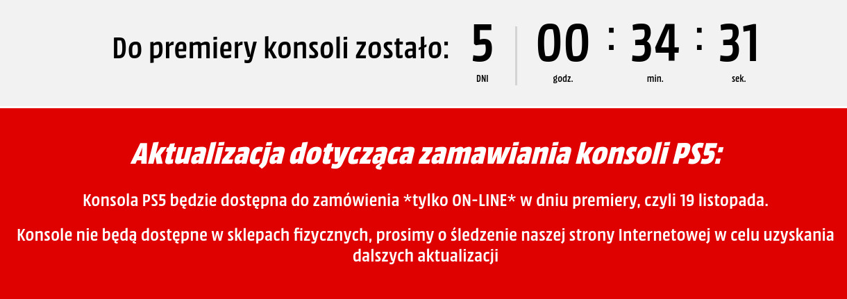 Bardzo dobra wiadomość napłynęła dziś z polskich sklepów. Tak jak zapowiadało wcześniej Sony, w dniu premiery nie będzie można kupić PS5 na półkach sklepów ze względów bezpieczeństwa (a u nas dodatkowo z powodu lockdownu), natomiast sklepy do których zdążą dojechać dodatkowe egzemplarze, będą je mieć w ofercie ( Sony potwierdza - nie będzie konsol na półkach w dniu premiery!).