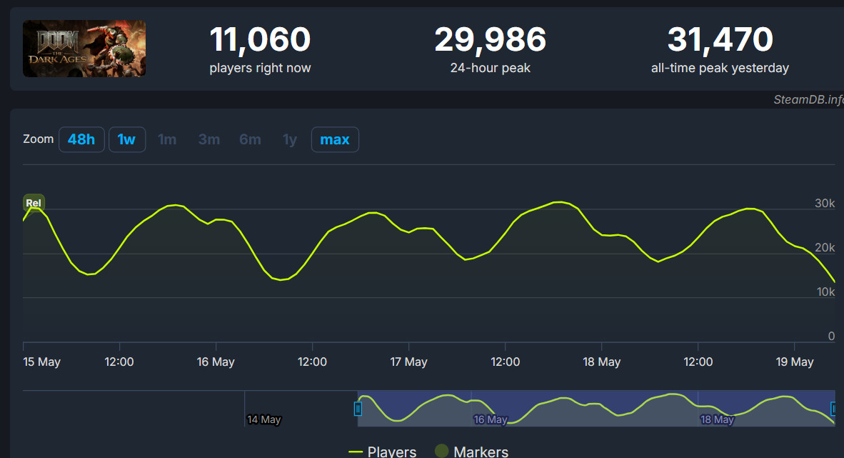 Doom: The Dark Ages mimo dobrych ocen zebranych w recenzjach, nie zdołał podbić platformy Steam. W pierwszy weekend po premierze, w najnowszego Dooma bawiło się 31 tysięcy graczy jednocześnie, co nie jest złym wynikiem, ale zdecydowanie nie można nazwać do dobrym.