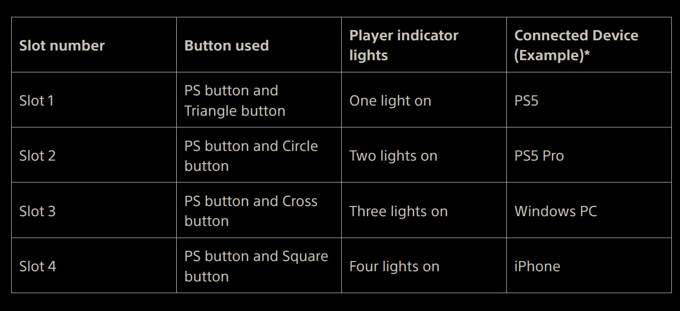 Gdy urządzenie zostanie zarejestrowane w kontrolerze, możesz przełączać się między urządzeniami, naciskając przycisk PS oraz przycisk akcji (trójkąt, kółko, krzyżyk lub kwadrat) odpowiadający slotowi. Możesz to zrobić zarówno wtedy, gdy kontroler jest włączony, jak i wyłączony.