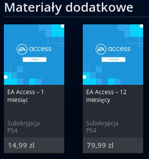 15zł za miesiąc lub 80zł za rok - tyle kosztuj EA Access na PS4. Jeśli macie już abonament na PC czy Xboxa, musicie kupić osobny na PS4, nie można korzystać z tego samego. Niemniej, 15zł miesięcznie (lub 6,66zł przy płatności za rok z góry) nie brzmi tak źle, za niemal 50 gier - zwłaszcza, jeśli jesteście np. fanami piłki nożnej czy lubicie granie online. Jest tylko jeden haczyk - gra online nadal wymaga posiadania PS+. W ramach abonamentu czasowo mogą być dostępne wersje beta, czy też gry mogą pojawić się kilka dni/godzin przed oficjalną premierą. Dostajecie też 10% zniżki na zakup gier w abonamencie, gdybyście planowali go już nie przedłużać a chcieli kupić pozycję. W cenie jednej gry można jednak kupić abonament aż na 4 lata i grać (obecnie) w 46 gier więc... wiadomo co lepsze. Jeśli kupujecie gry cyfrowo - warto przemyśleć abonament.