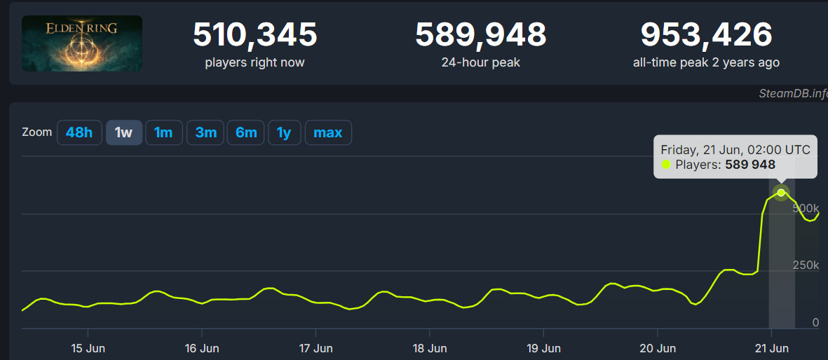 Dodatek "Elden Ring: Shadow of the Erdtree" odniósł spektakularny sukces na platformie Steam, zyskując ogromne uznanie wśród graczy. W dniu premiery, liczba jednocześnie grających przekroczyła pół miliona, co jest imponującym wynikiem dla dodatku wydanego w czwartek!