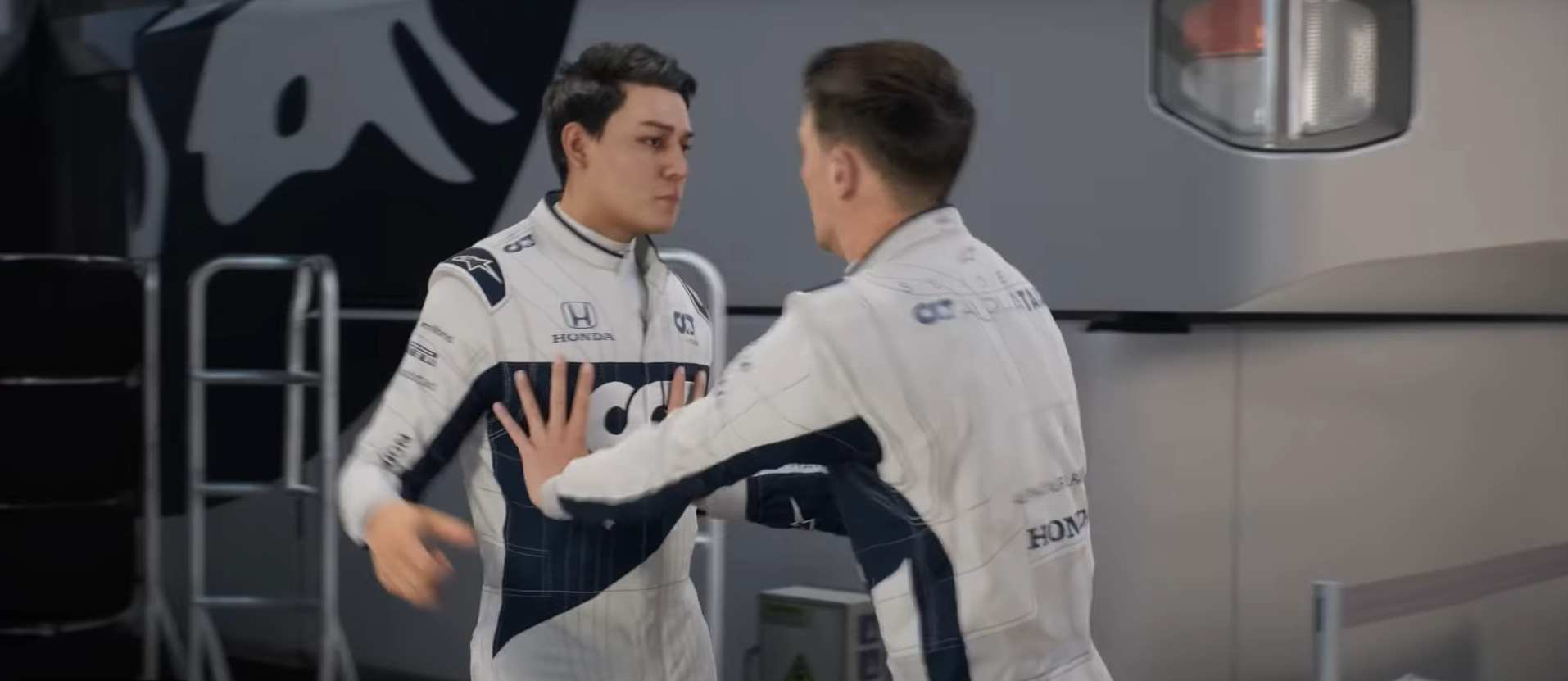 Największe zmiany dosięgną jednak tego, co poza torem. Kierowcy i inne postaci z padoku dostaną teraz lepsze animacje, samo zaplecze też ożyje i pojawi się w nim więcej ludzi - nie będziemy już tylko świadkami suchych wywiadów z Claire i dialogów z naszym konkurentem - będą też krótkie ujęcia otoczenia, zobaczymy rozmowy szefów teamów, a na trailerze możemy nawet ujrzeć bijących się kierowców - to zapowiedź trybu Breaking Point. Widać, że chociaż wciąż jest nieco sztucznie, to pojawił się tutaj raczej jakiś motion capture. Tutaj również dodano rozmycie tła w ujęciach i gra mocno przez to zyskała na wyglądzie.
