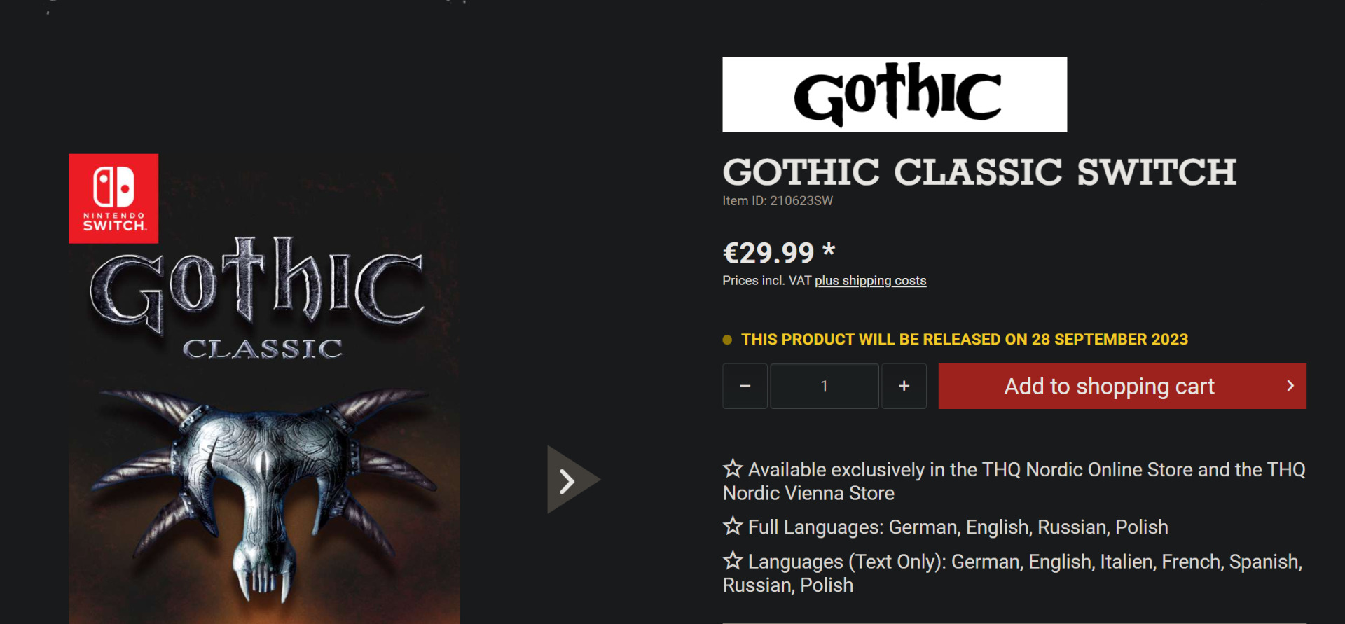 Gothic 1 Classic zostanie wydany na konsolę Nintendo Switch 28 września 2023 roku w pełnej polskiej wersji językowej, z napisami i dubbingiem oraz poprawkami usprawnieniami gry. Aby zapoznać się ze wszystkimi poprawkami i aktualizacjami tego wydania, zajrzyjcie pod ten ten adres.